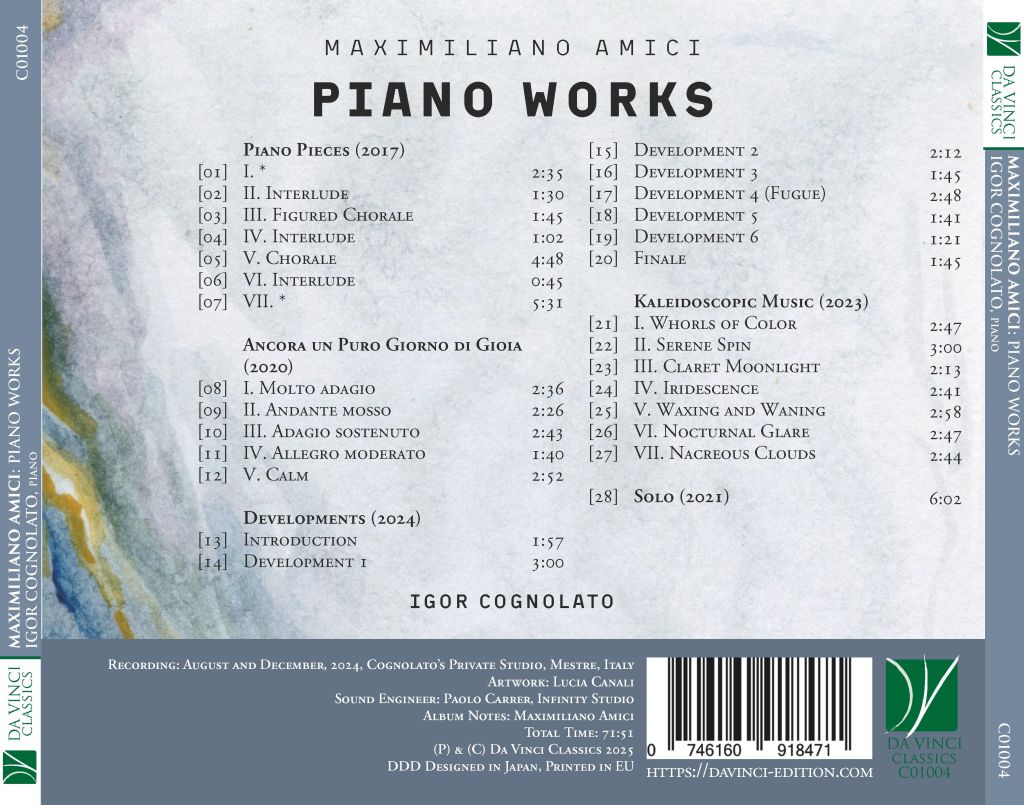 This recording offers an illuminating overview of Maximiliano Amici’s piano output composed between 2017 and 2024, brought to life by pianist Igor Cognolato. A composer of refined sensibility and structural clarity, Amici studied under Luciano Pelosi and Stephen Jaffe. He earned his master’s degree in composition at the Santa Cecilia Conservatory in Rome and his doctorate in music composition at Duke University.